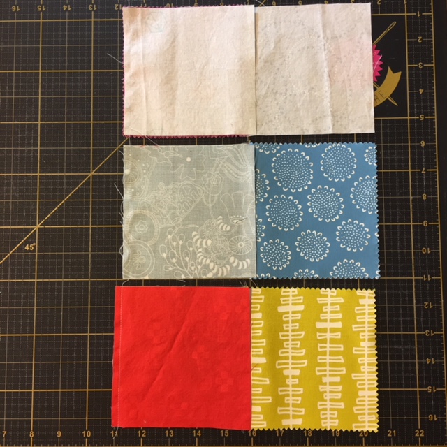 We will use nine 5-inch squares for each block. Four will be low volume and five will be bright colors that contrast well with the low volume fabrics.